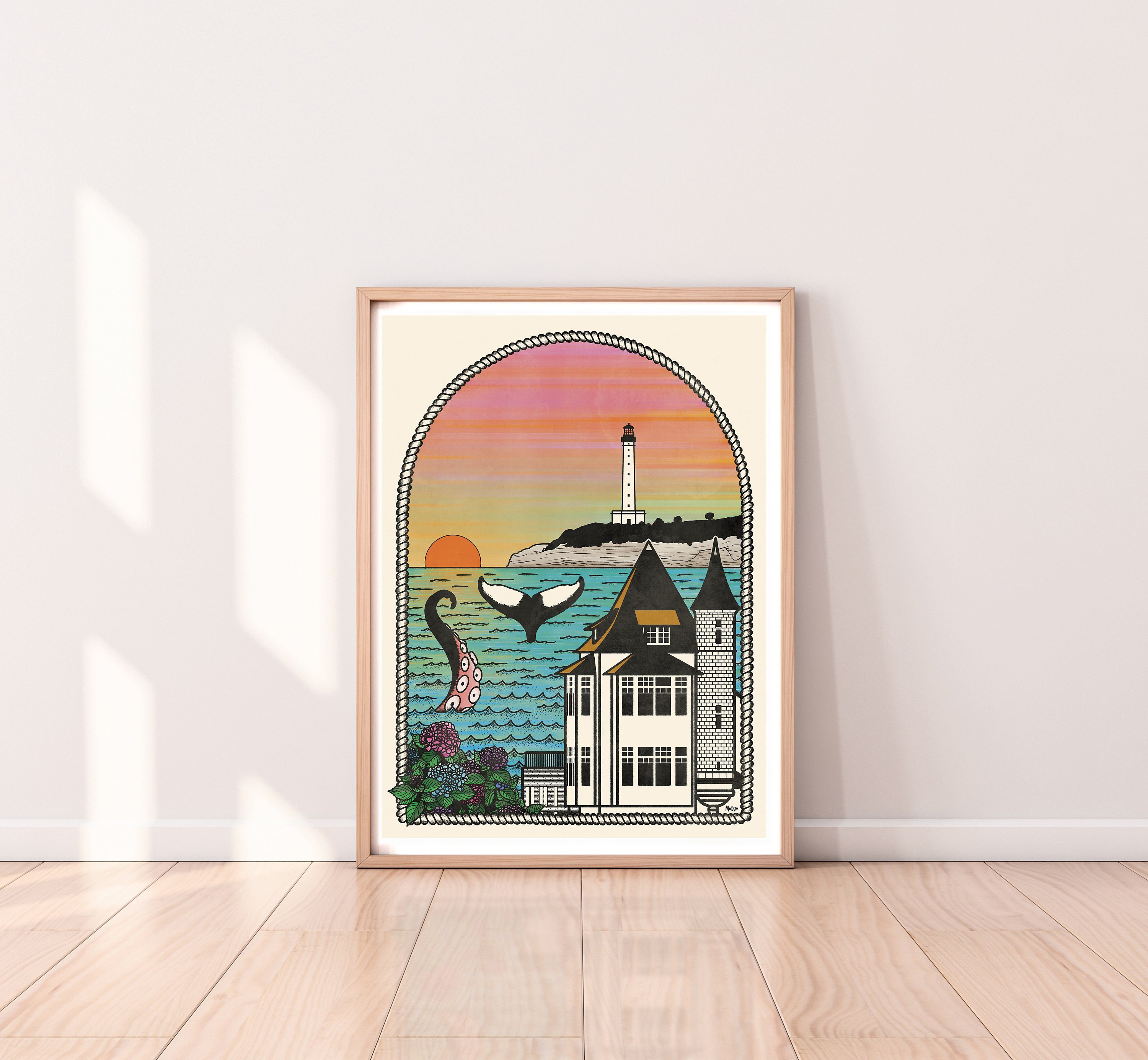 With its bright colors and unique graphic style, this creation transports the viewer into the peaceful and magical world of the magnificent sunsets that can be admired in Biarritz. We find its elegant lighthouse, the mountains, its turquoise sea and its marine creatures such as the whale and the octopus, all bathed in the soft glow of its sky at dawn.